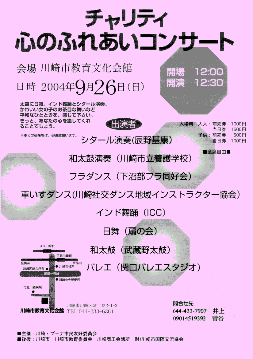 中越沖地震の義援金コンサート 出演:フルート 山本俊自 山本陽子 安枝誠悟 シタール 辰野基康 タブラ 逆瀬川健治 フラメンコ 小林伴子舞踊団 他 開場18:30 開演19:00 料金2000円 当日2500円 |